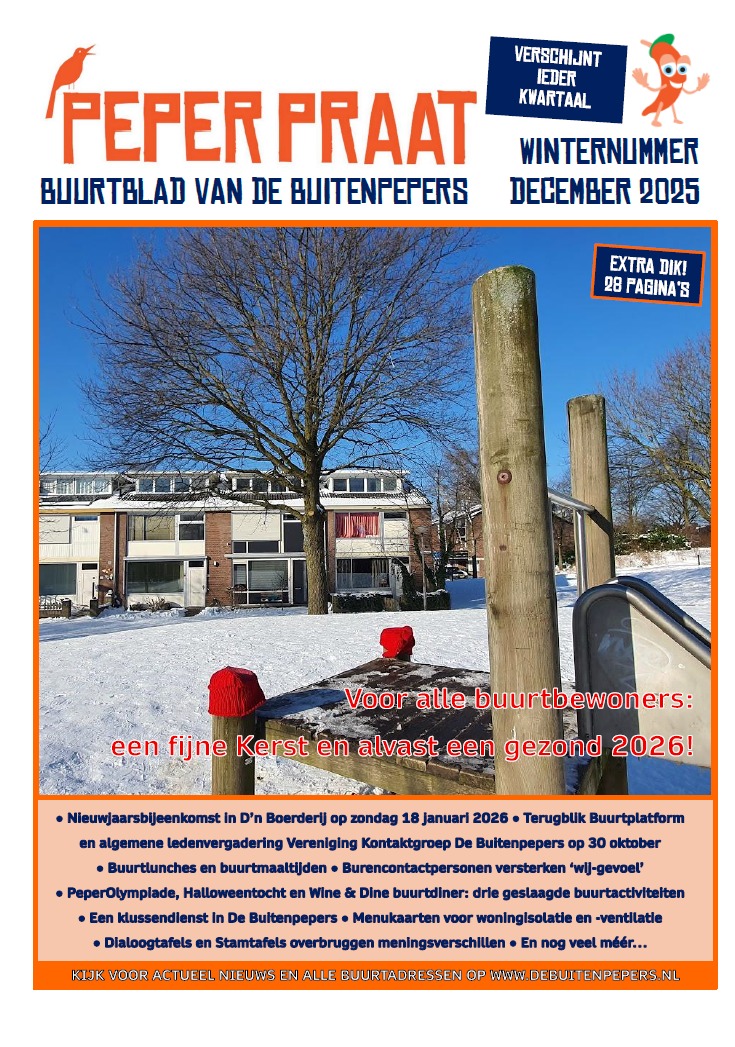 In het decembernummer van ons buurt- en kwartaalblad de Peperpraat weer veel nieuws en berichten over allerlei activiteiten in en rond onze buurt. Hieronder vind je de digitale versie van ons kwartaalblad. Onze bezorgers zorgen vanaf donderdag 27 november voor de bezorging van de papieren versie in alle straten van onze buurt. Dit winternummer staat boordevol buurtnieuws en telt maar liefst 28 pagina’s.