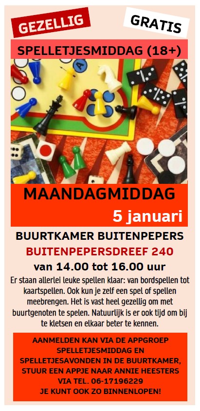 Maandagmiddag 5 januari 2026 van 14.00 tot 16.00 uur, Spelletjesmiddag in de Buurtkamer, Buitenpepersdreef 240. Aanmelden via een appje naar Annie Heesters, tel. 06-17196229. Je komt dan in de appgroep ‘BP Spelletjesmiddag in de Buurtkamer’.