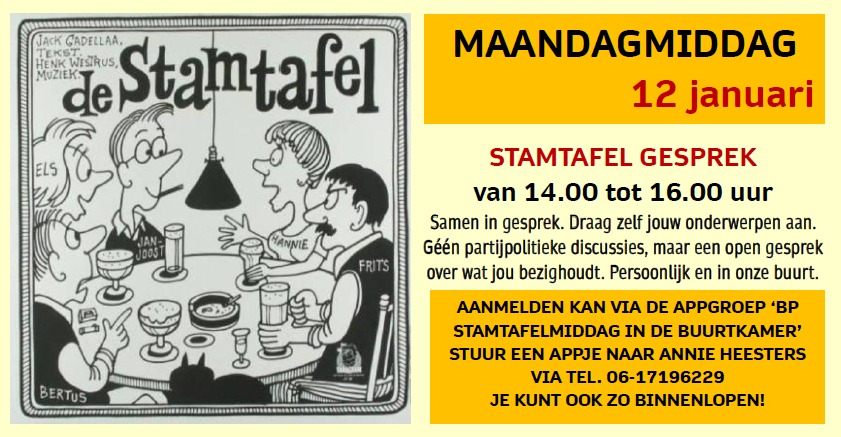 Maandag 12 januari van 14.00 tot 16.00 uur, Stamtafelmiddag in de Buurtkamer, aanmelden is niet nodig.