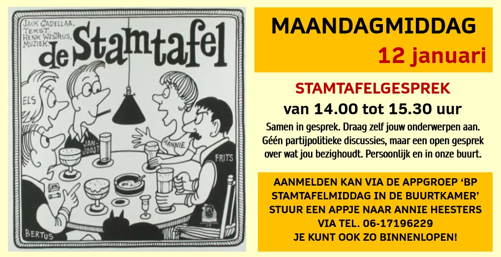 Maandag 12 januari van 14.00 tot 15.30 uur, Stamtafelmiddag in de Buurtkamer, aanmelden is niet nodig.