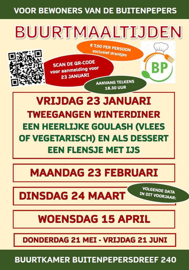 Vrijdagavond 23 januari van 18.30 tot 20.30 uur, Buurtmaaltijd voor uitsluitend bewoners van De Buitenpepers in de Buurtkamer, Buitenpepersdreef 240. De prijs van de buurtmaaltijd bedraagt € 7,50 voor twee gerechten. Per keer maken twee koks van de Buurtgroep de maaltijd en iedere keer is er een andere gastvrouw of -heer. Per maaltijd serveren de koks twee gerechten. Het hoofdgerecht is telkens vlees of vegetarisch. De maaltijd begint om 18.30 uur en duurt ongeveer twee uur. Je kunt je aanmelden via deze link:https://forms.gle/4A2cwoGn7ur9NegF6 Na jouw aanmelding ontvang je van ons een bevestiging. Let op! Je bent alleen aangemeld na onze bevestiging.