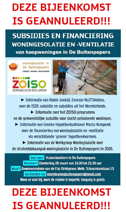 Donderdag 26 maart, Informatiebijeenkomst over subsidies en financiering van woningisolatie en -ventilatie, inclusief subsidies voor slecht geïsoleerde woningen, van 19.30 tot 21.30 uur, Bewonersruimte Flat Ortduynen, Weth. Schuurmanslaan 11. DEZE BIJEENKOMST IS GEANNULEERD!!!