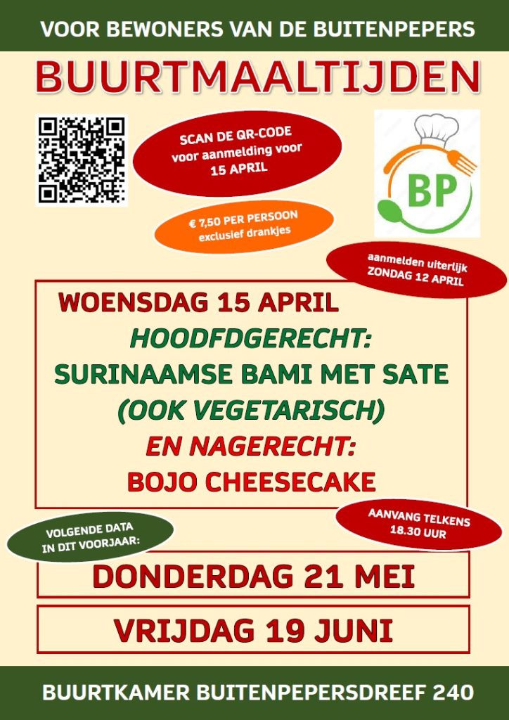 Het menu voor de buurtmaaltijd op woensdagavond 15 april is bekend. Het hoofdgerecht is Surinaamse Bami (niet te pittig) met saté (ook vegetarisch) en als nagerecht Bojo cheesecake.
