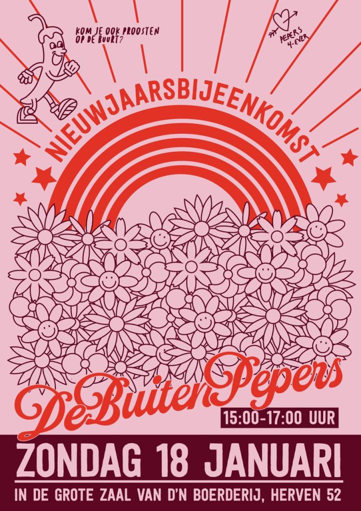 Dank tenslotte aan alle bewoners die een bijdrage voor de Nieuwjaarsbijeenkomst hebben betaald. Dank daarvoor. De bijeenkomst was ook mogelijk dankzij een subsidie vanuit het Wijk-, Buurt- en Dorpsbudget van de gemeente ‘s-Hertogenbosch. En dank aan Irene Hinderks voor het ontwerp van de affiche voor deze Nieuwjaarsbijeenkomst.
