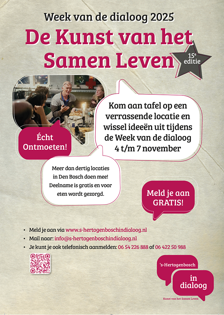 Kennen we elkaars verhalen wel? Luisteren we? Voelen we elkaar aan? We zien veel. We horen veel. We roepen veel, vaak op ‘veilige’ afstand van elkaar, achter een scherm. Of we blijven ‘veilig’ binnen ons eigen kringetje. Maar samenleven begint met samen komen. Échte ontmoetingen zijn ontmoetingen in het echt. Kom daarom samen eten en ga met elkaar in gesprek. Op dinsdag 4, woensdag 5, donderdag 6 en vrijdag 7 november organiseert ‘’s-Hertogenbosch in Dialoog’ overal in onze gemeente dialoogtafels tijdens de ‘Week van de Dialoog’. Met dit jaar als thema ‘Echt ontmoeten’!