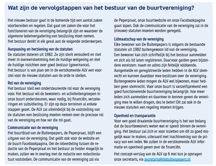 In dat Buurtplatform is bovendien afgesproken om verder overleg te voeren tussen het zittende bestuur en het hiervoor genoemde drietal om tot een goede bestuursovergang te komen. Volgens de statuten van de Vereniging Kontaktgroep De Buitenpepers zou het zittende bestuur daarom een ALV moeten organiseren om tot een goede overdracht te kunnen komen. Helaas heeft dat zittende bestuur, ondanks allerlei verzoeken in de periode tussen begin december 2024 en mei 2025, op geen enkele manier meegewerkt om een ALV te houden. Daardoor werd de gewenste doorstart van de vereniging feitelijk belemmerd.